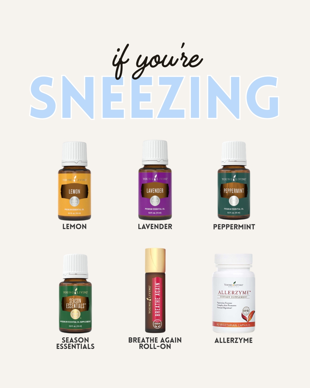 Pair Lavender, Lemon, and peppermint in your diffuser or in a roller blend. Add Season Essentials to a capsule for a great daily supplement. Take Allerzyme a couple times a day to help with histamine responses. Slather yourself in Lavender & Breathe Again before heading out in the beautiful blooms!